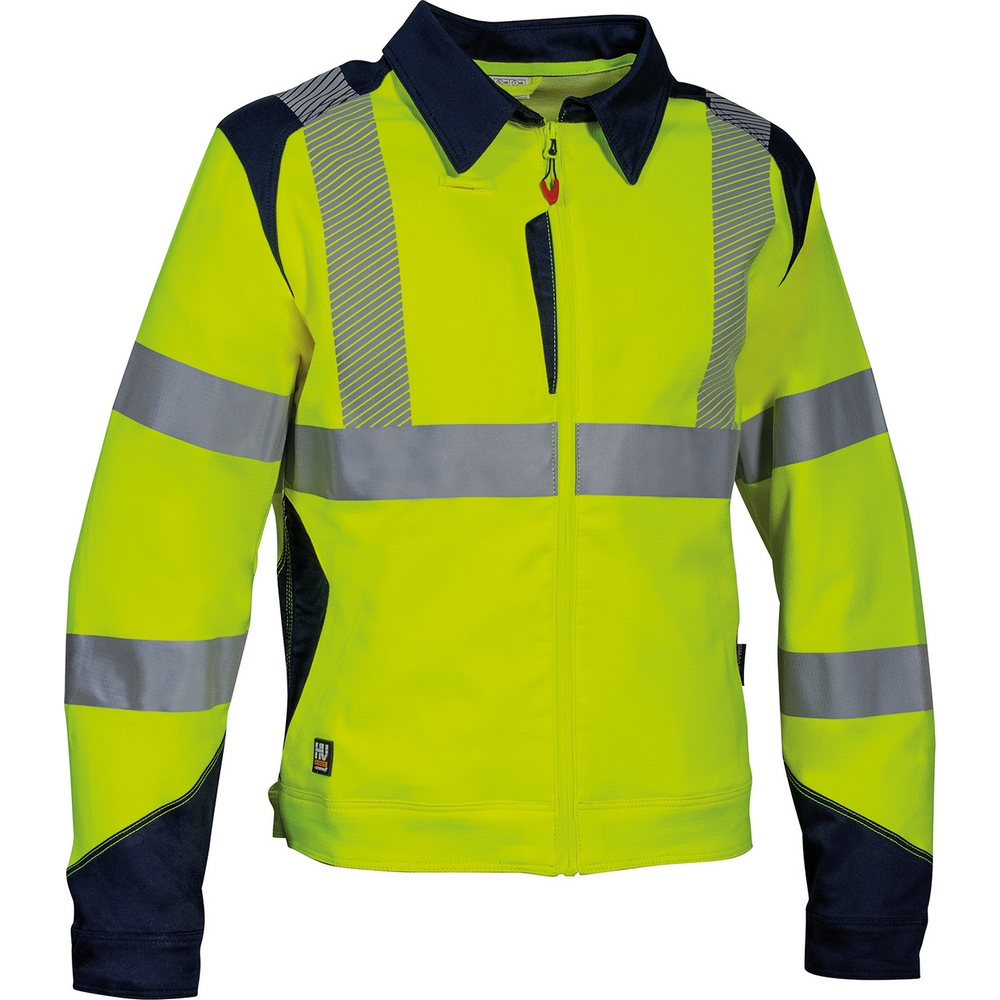 1 yatay reflektör şerit, fermuarlı 2 geniş alt cep, 2 parçalı dikey reflektör şerit, rozet cebi halkası, çıtçıtla ayarlanabilir bel ve manşetler, E-WARD kumaştan fermuarlı göğüs cebi.