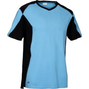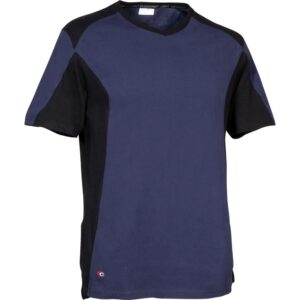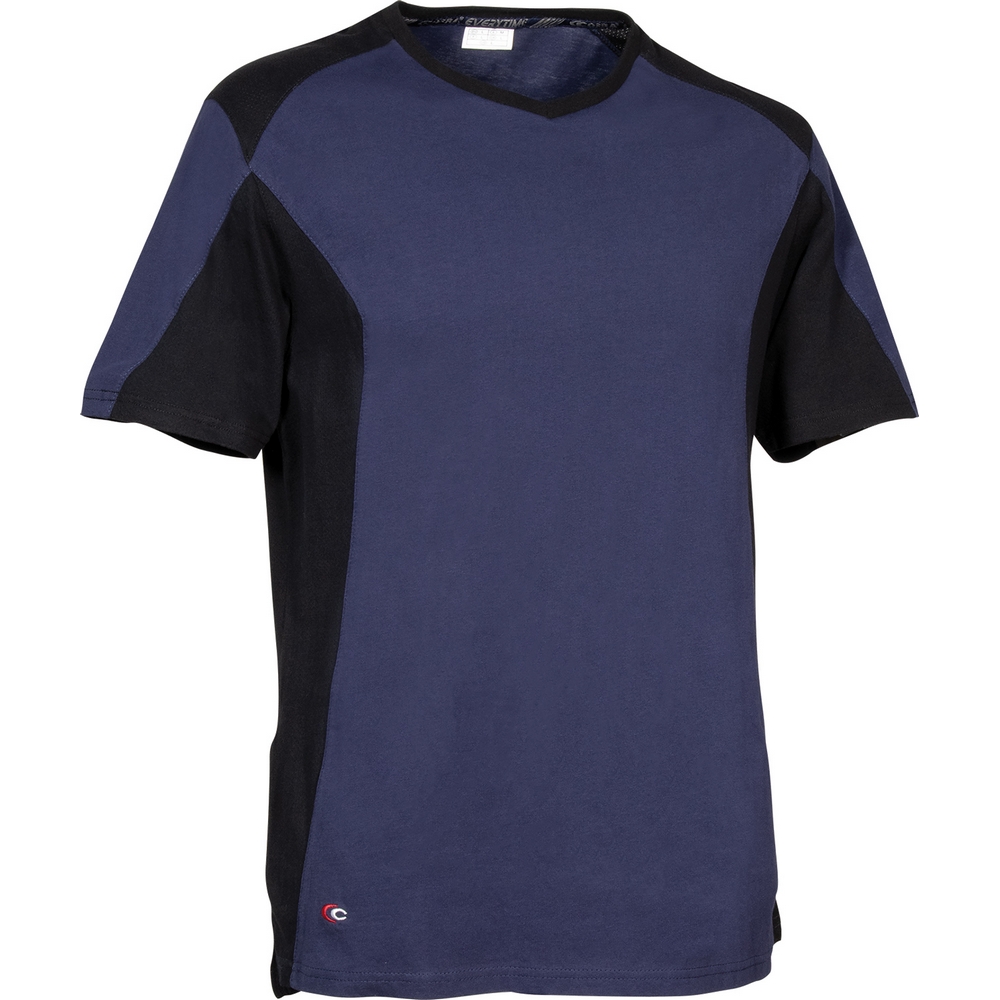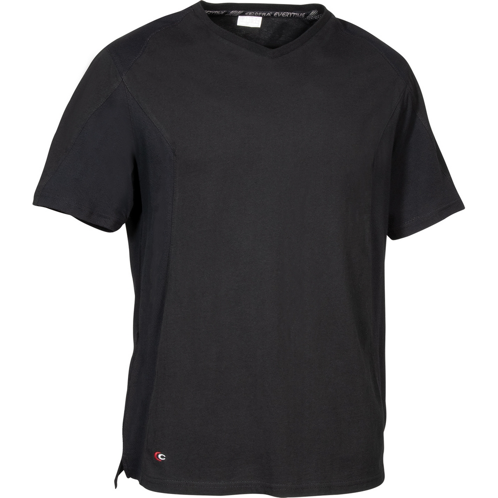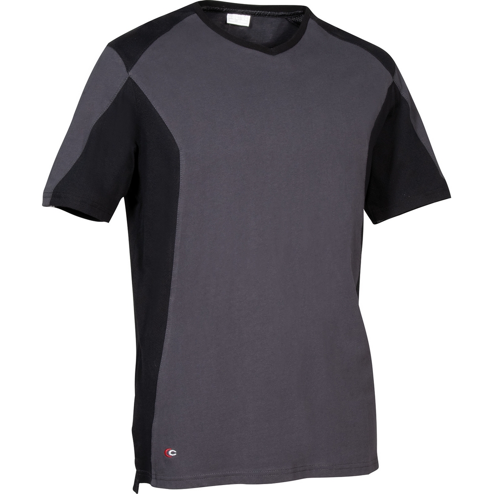 Daha iyi nefes alabilirlik için yan, koltuk altı ve omuz bölgelerinde delikli pamuk paneller, V yaka, yan yırtmaçlar, pamuk tişört.