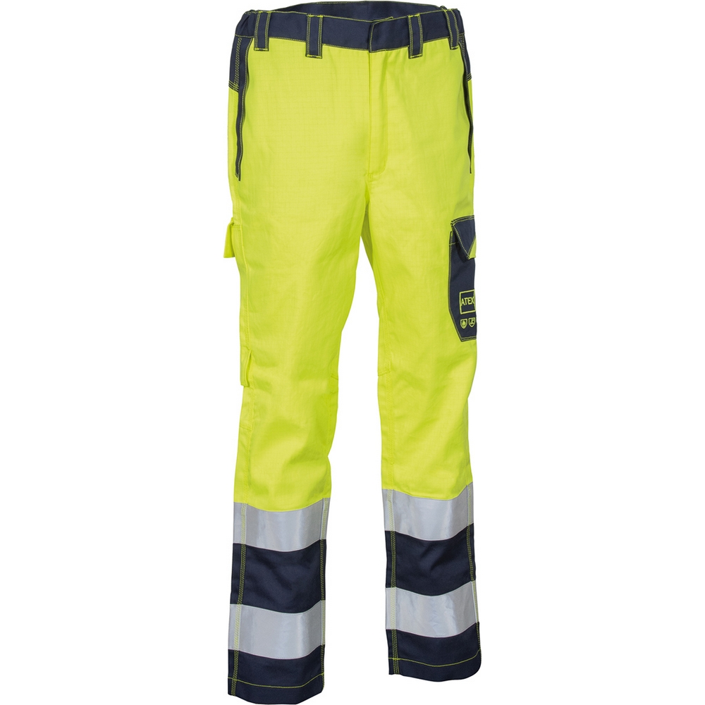 2 geniş ön cep, 2 arka cep, alev geciktirici reflektör şeritler, ATEX ortamları için uygun, yan cepte standart piktogram nakışları, yan cepte “ATEX” nakış, diz ve bacak ergonomik tasarım, yan cep, metre cebi, aşınmaya maruz kalan bölgelerde üçlü dikiş, YKK® fermuar.