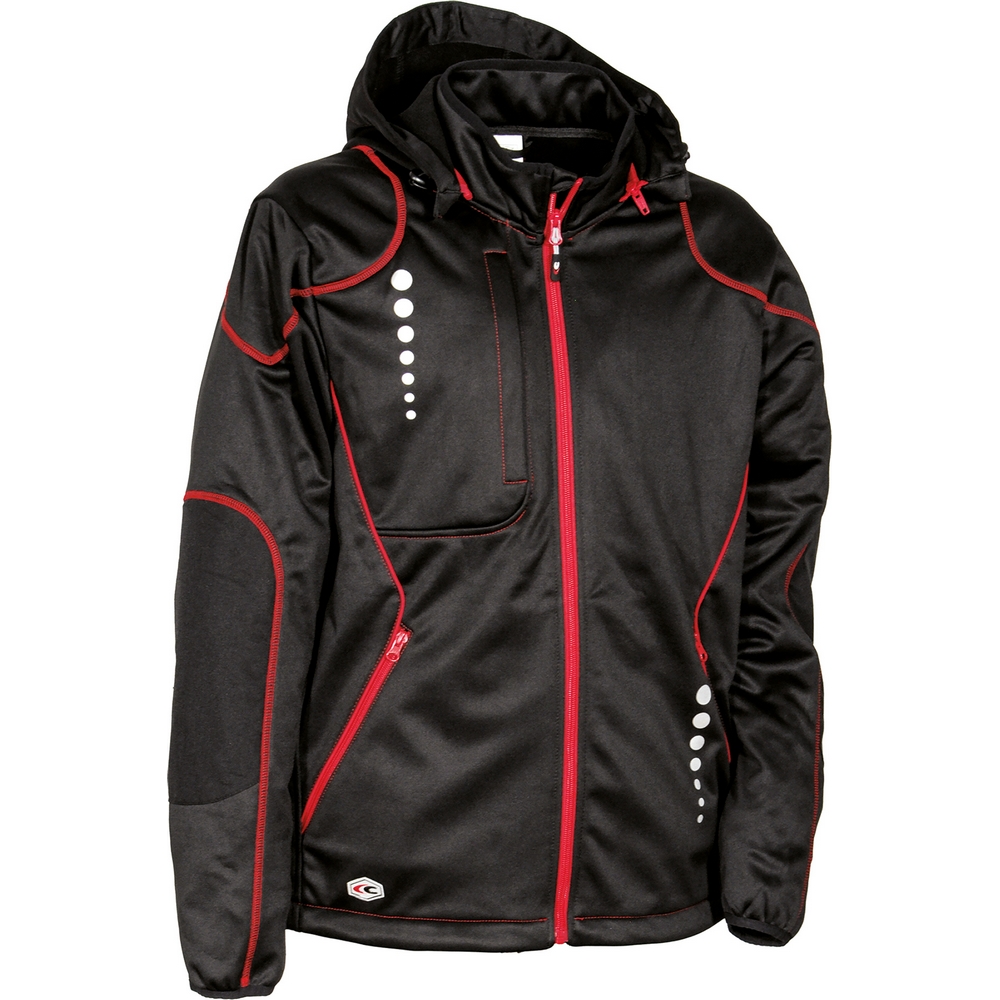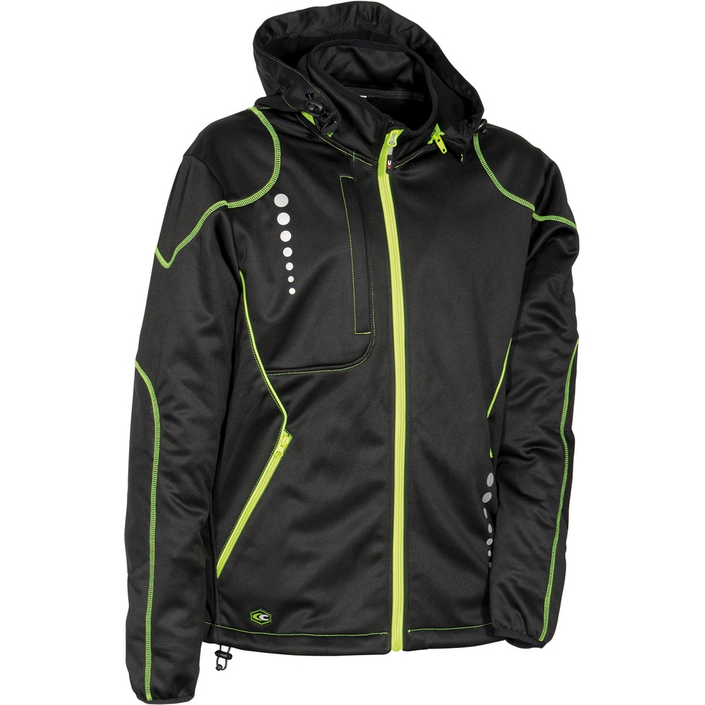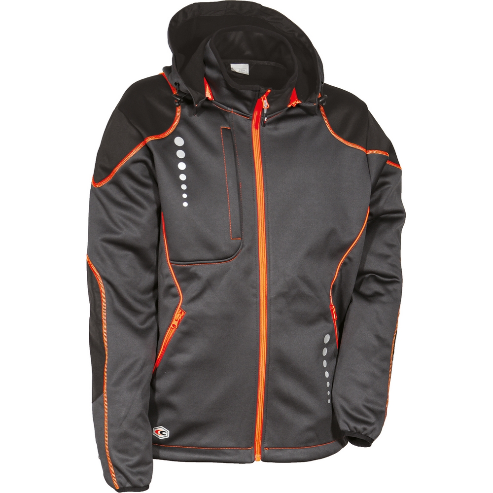 Fermuarlı 1 adet göğüs cebi, fermuarlı 2 adet geniş alt cep, önden fermuarlı kapama, fermuarla çıkarılabilir ve ayarlanabilir kapüşon, iç kısmı polar (pile) kaplı softshell mont, reflektif detaylar, çeneyi koruyan kapak (flap), ayarlanabilir etek ucu için büzgü (kordon), esnek kumaş, aşınmaya dayanıklı dirsek yamaları.