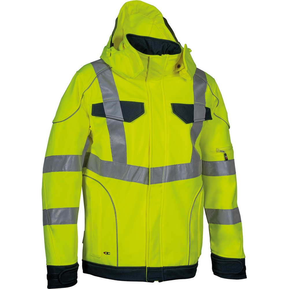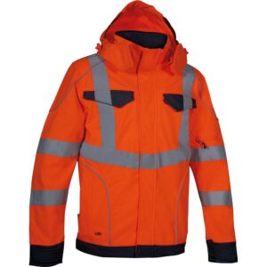 Cırt cırt kapamalı 2 geniş göğüs cebi, fermuarlı 2 geniş ön cep, sol kolda fermuarlı 1 cep, sabit kapüşon (çıkarılamaz), daha iyi görünürlük için kauçuk ekli çıkarılabilir kapüşon, cırt cırtlı ayarlanabilir manşetler, YKK® fermuar, iç kısmı pelüş olan SOFTSHELL ceket, 3M™ SCOTCHLITE™ Reflective Material – 8906 Silver Fabric reflektör ekler, ayarlanabilir alt kısım için kordon.
