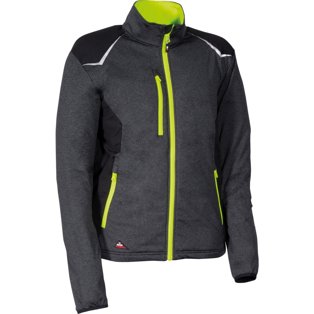 Fermuarlı 1 adet göğüs cebi, fermuarlı 2 adet geniş alt cep, önden fermuarlı kapama, %100 geri dönüştürülmüş polyester (PET) sweatshirt, reflektif detaylar, melanj kumaş.